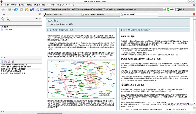 これはサイドバーを中心に登録リストを確認してくのですが、記事のサマリの確認の仕方がおもしろい。登録しているサイト名をクリックするとローカルでページが表示されます。ここにきれいに記事のタイトルとサマリが並んでしまうのです。RSS2.0などでは記事の内容まるまるが配信されている場合もありますのでほとんどそのままサイトの記事を読んでいる感じ。ある意味これでもことが足りちゃいそうです。